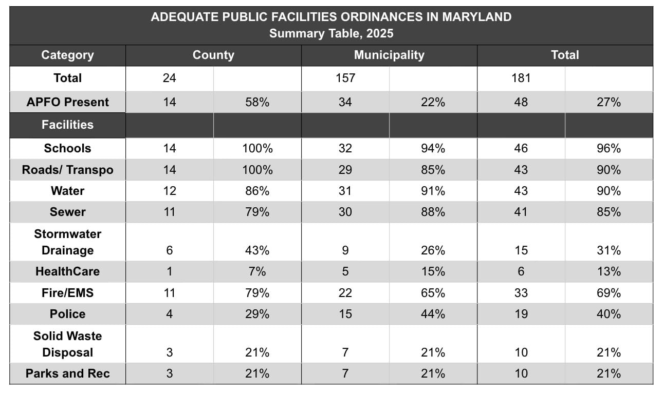 Last spring, NCSG Graduate Assistant Sarah Kamei Hoffman led research and analysis on Adequate Public Facilities Ordinances (APFOs) across the State of Maryland on behalf of the Maryland Department of Planning (MDP). The final report features three major sections: (1) an overview and status update on APFOs in Maryland counties and municipalities, (2) a literature review on the relationship between APFOs and housing, and (3) best practices for jurisdictions considering or using APFOs.